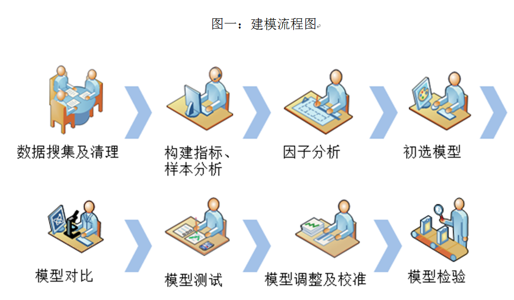 严谨的建模流程和科学可行的方法是确保模型可用的基础。建模流程从样本数据的收集和整理开始,然后是模型指标的构建和筛选,主要是构建备选指标库并通过相关分析、单因素分析等多种统计方法对指标进行筛选,利用筛选过的指标构建多个备选模型,并通过随机样本集对模型进行稳定性和准确性的测试,选择最优的模型并对指标权重进行人工干预,最后对模型分别进行样本内外的测试,以保证模型的普遍适用性。