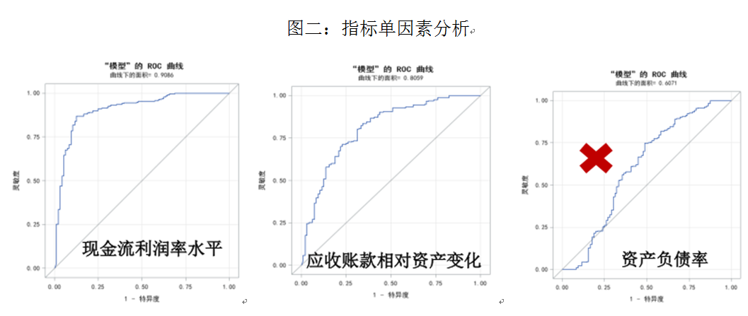 通过对指标进行非参数检验、相关分析和单因素分析,剔除不能明显区分造假与正常样本和效果较差的指标(如图一的资产负债率),并对明显存在共线性的指标进行筛选,减小多重共线性对于模型指标估计值的影响,通过上述步骤筛选出初步的建模指标,并对样本进行异常处理,减少异常值对于模型准确性和稳定性的影响,最后借助建模软件及经验的干预,在保证模型统计学和经济学意义的前提下,反复调整指标,得到多个备选模型。