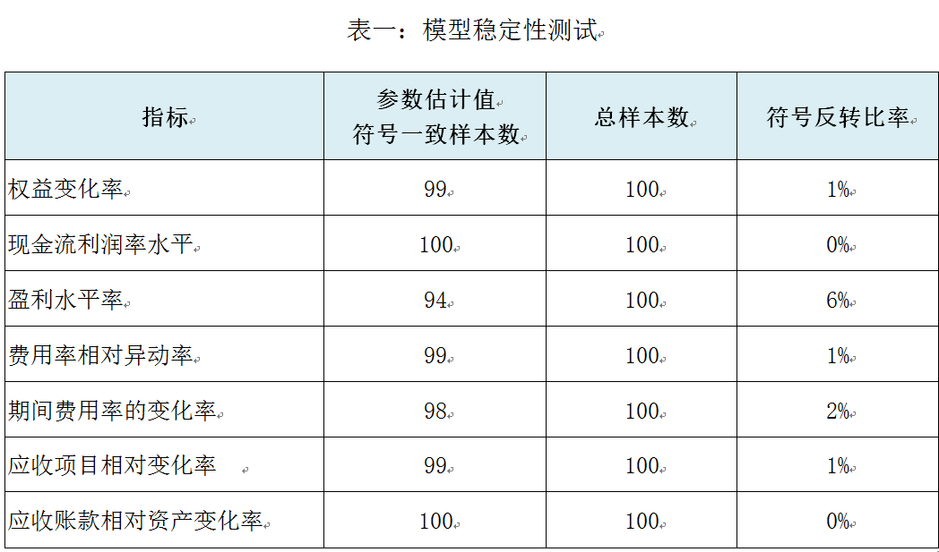 为了对比备选模型之间的效果,利用随机样本对备选模型进行准确性测试,通过比较模型的拟合度和指标估计值,选择表现最优的模型,同时为了测试模型对于不同样本以及在今后实际应用过程中的适用性,我们将通过随机样本对模型的稳定性进行检验,观察估计值的符号反转情况(如表一,指标符号几乎并未反转),且在准确性没有明显降低的前提下,对指标权重进行人工干预和调整以保证模型的均衡性和合理性,从而得到最终模型。