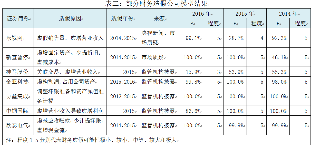 为了保证准确性和普遍适用性,模型的测试和验证步骤必不可少。财务虚假识别模型样本内的准确度可达93.4%(其中第一类错误5.91%,第二类错误7.29%),整体效果较好。同时,对于市场上最新披露的财务造假公司(如乐视网、新査矿业、神马股份、欣泰电气等)也有很好的识别效果。