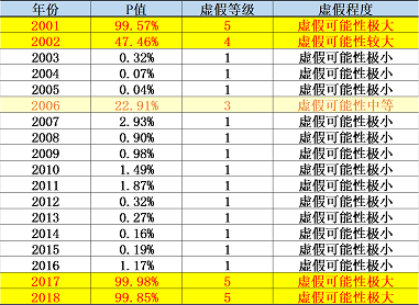 施久开发的财务虚假识别模型显示,自2001年上市以来,XM药业除上市之初的2001年和2002年,2006年以及2017年和2018年财务报表的虚假可能性为中等及极大以外,其他年份财务的虚假可能性都极小。如果仅仅截取2003年至2016年财务报表,XM药业可以说完美地骗过了施久的财务虚假识别模型,若是XM药业这些年份的财务报表也如2017年那样存在大量“会计差错”的话。