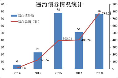 截止18年9月27日,中国债券市场共87家主体发生违约,涉及债券234支,金额1709.38亿。其中,2014年发生6起违约事件,涉及金额13.4亿元;2015年发生23起违约事件,金额共计125.52亿元;2016年债券违约持续发酵,共有78支债券发生违约,金额总计393.01亿元;2017 年共有51支债券发生违约,涉及金额403.24亿元;截止2018年三季度,共有76支债券发生违约,共计774.21亿,无论是数量还是金额都较之前有了明显增加,甚至出现4家主体发行的5支债券一天集中违约的情况。