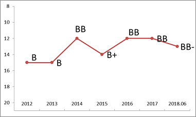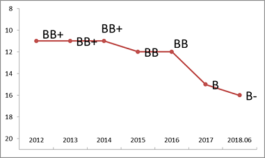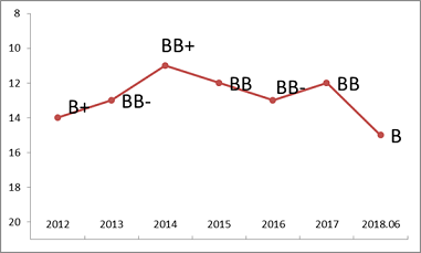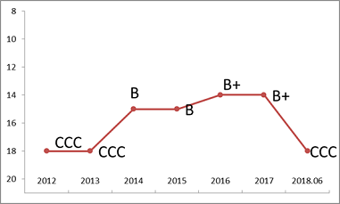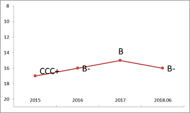 上述施久模型显示,利源精制历史评级状况极其不理想,2012年评级仅为B+。虽然在13年和17年利源精制通过增发股票,一定程度上改善了其财务表现,导致定量评级结果呈现了一定上升,但总体来说,评级仍相对较低,18年半年报,公司现金流和盈利明显恶化,流动性紧张,模型评级快速下降至级别B。而外部评级之前一直稳定维持在AA,直到违约后才将级别调至级别C。