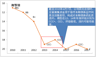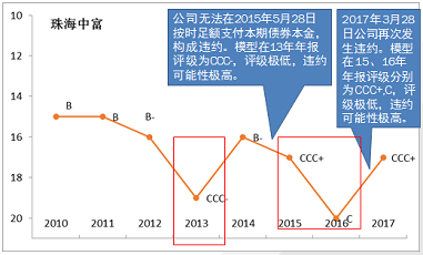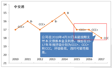 由于财务数据缺失,施久定量模型只能计算刚泰集团2015年之后的评级结果。模型结果显示,刚泰集团2015年年报评级结果为CCC+,处于极低水平,出现违约的可能性很高。此后刚泰集团财务报表表现略微好转,级别小幅上升,但仍处于极低水平。同时,施久财务虚假识别模型显示2015-2017年财务虚假可能性极大,报表真实性值得怀疑。外部评级之前一直维持在AA,在违约后才将评级降至C。